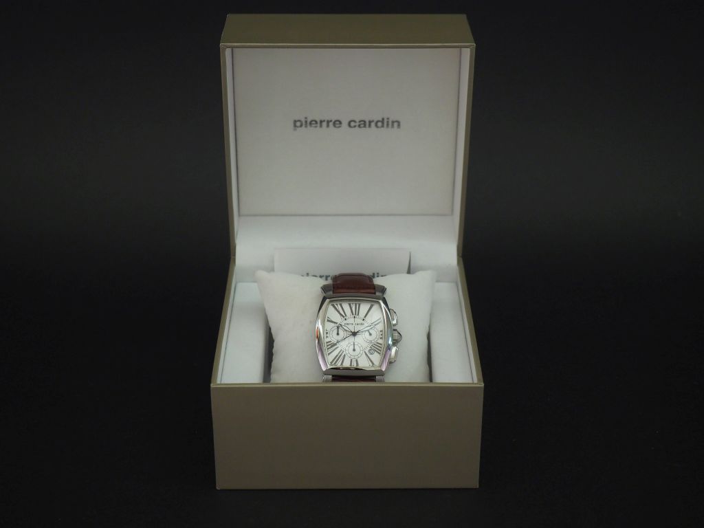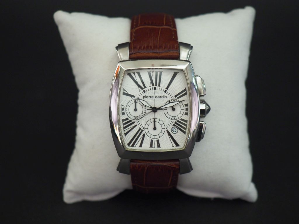 Pierre CARDIN, Time couture Montre bracelet, boitier rectangulaire de forme bombée en acier. Cadran à chiffres romains sur fond crème, trois compteurs. Guichet dateur entre 4h et 5h. Bracelet cuir marron, boucle ardillon. Signée. Dans son écrin. 41 x 36 cm