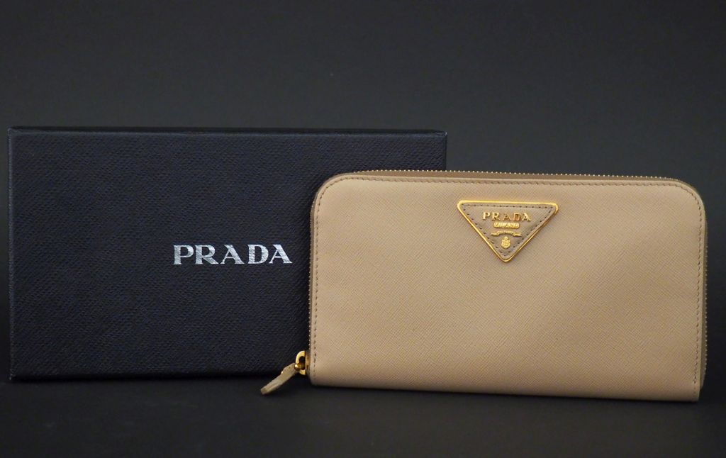 PRADA, Portefeuille en cuir crème. Fermeture à zip. Poches intérieures plaquées et une poche zippée. Signé. 11 x 19 cm Dans sa boite d'origine.