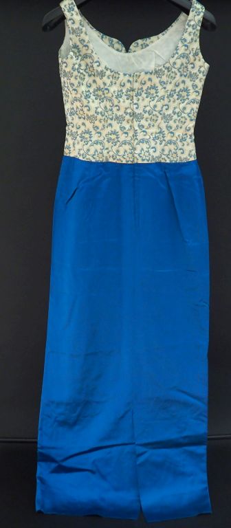 Robe de soirée sans manche probablement en soie ou satin. Le haut de la robe à motifs de rinceaux bleu rehaussé d'or sur fond crème et agrémenté d'un nœud de la même couleur que le bas de la robe. Pas d'étiquette, ni de taille apparente. Doit correspondre à un 38.