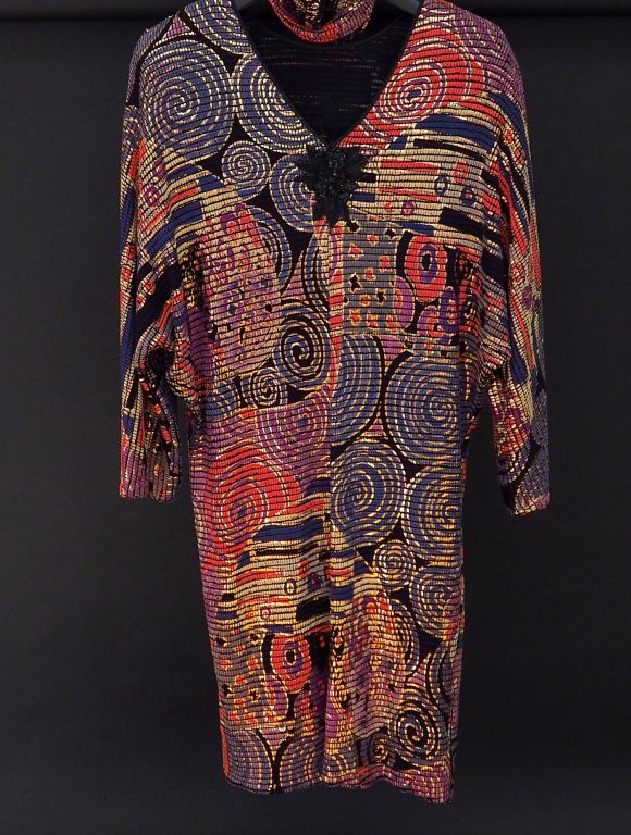 Robe fluide en tissu, à décor polychrome de motifs abstraits rehaussés de doré. Manches longues. Un motif de perles noires agrémente la robe au centre de la poitrine. On joint un tour de cou assorti. (Sans marque, ni taille)