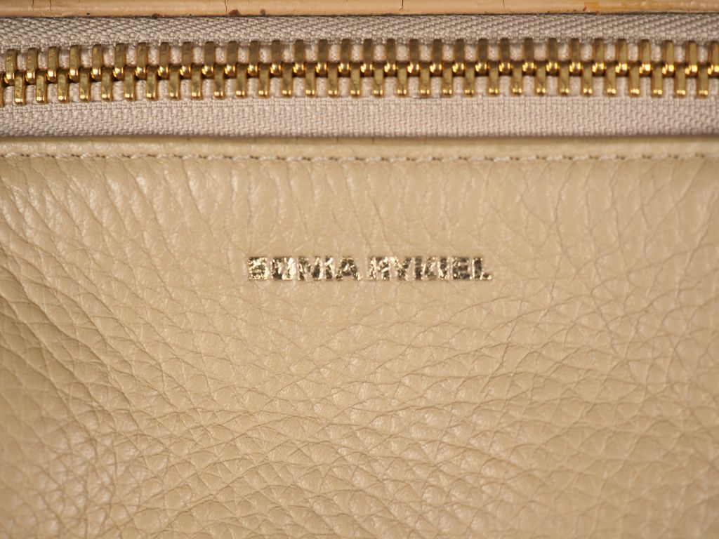 SONIA RYKIEL Sac à main en cuir beige. Une poche plaqué à l'extérieur contenant une pochette à fermeture éclair en daim moutarde. Fermeture éclair doré. Bandoulière. Signé. 25 x 32,5 cm (petites tâches d'usage à l'intérieur)