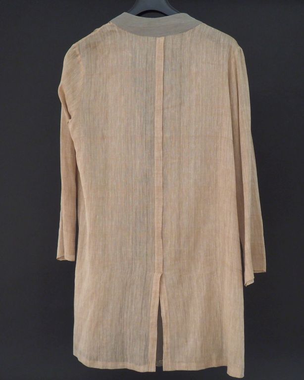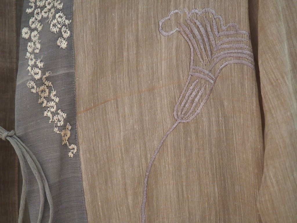 Sortie de bain ou tunique beige en soie (?), à décor de fleurs. Encolure de couleur bleue. Fermeture à l'avant par un lien. Taille. probablement : 36 (sans marque, ni taille apparentes)
