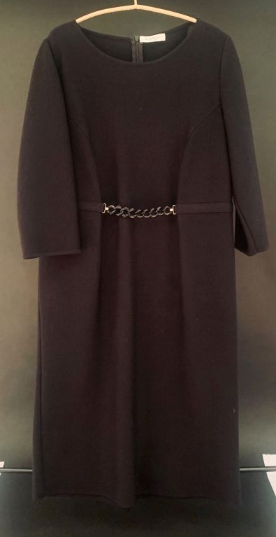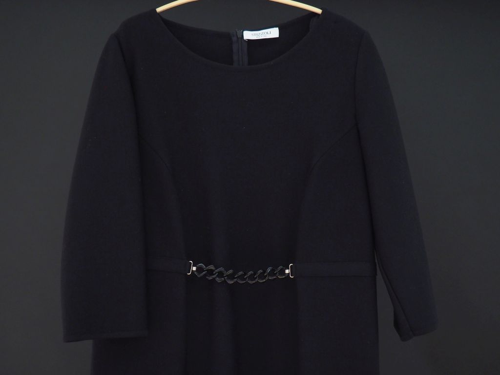 STIZZOLI, Robe noire à manche longue en laine (100%), agrémentée sur le devant d'un motif de chaine en plastique noir. Fermeture au dos par zip. Taille 48.