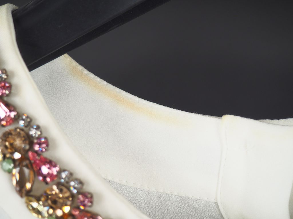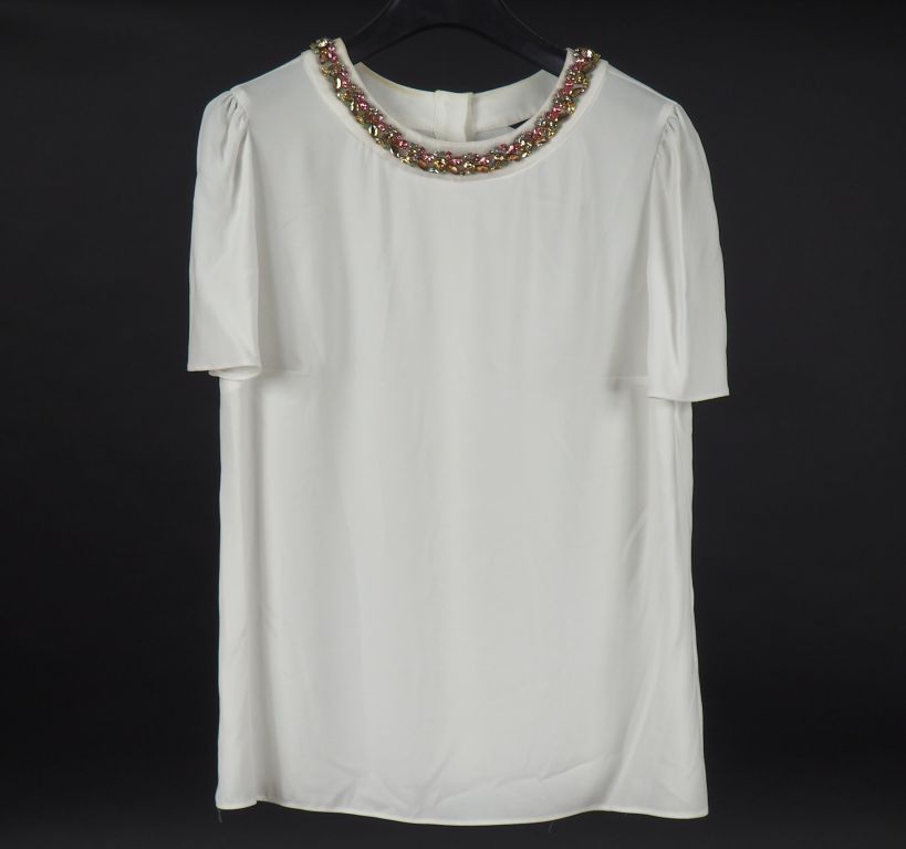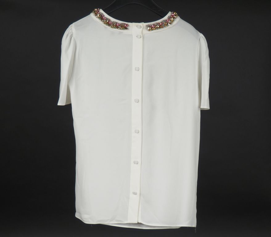 TARA JARMON Chemisier blanc à manches courtes, à col rond à décor de strass. Fermeture par sept boutons au dos. Taille 42. (taches)