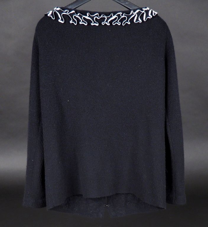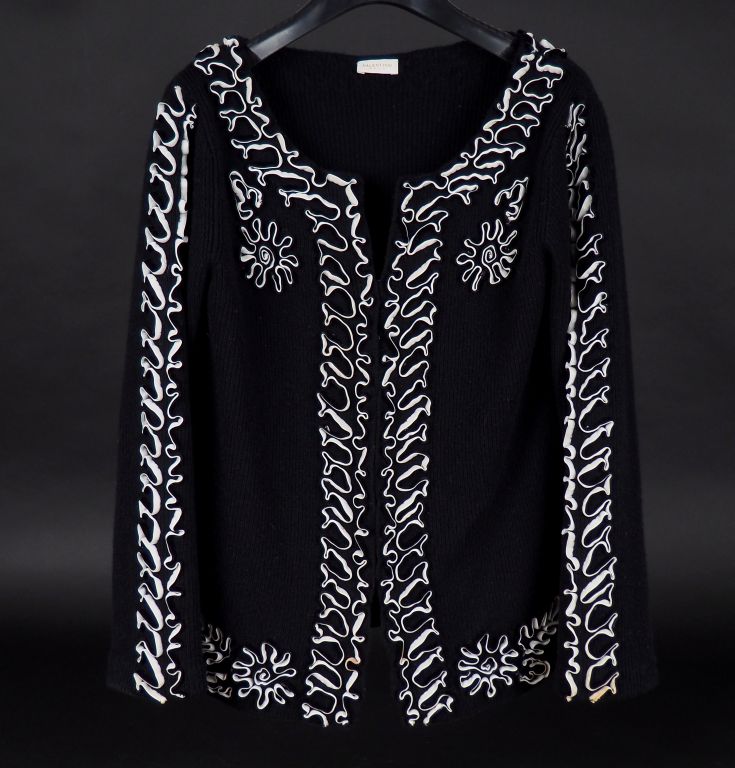 VALENTINO Gilet noir en cachemire et laine, à décor d'un galon blanc et noir formant des motifs floraux. Fermeture par huit crochets. (Quelques taches).