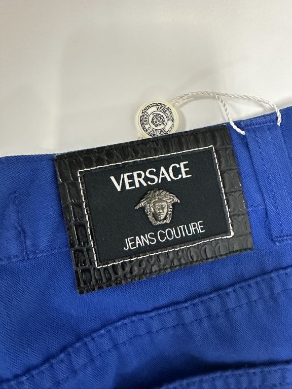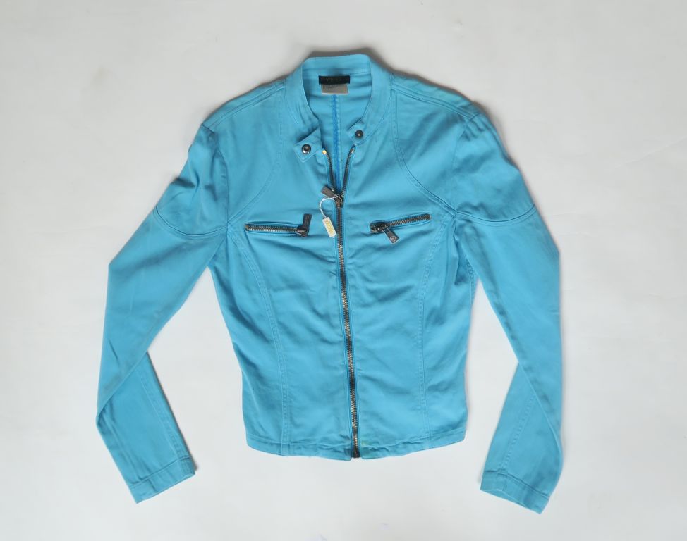 VERSACE Veste en coton (98%) de couleur turquoise. Fermeture à l'avant par zip. Bouton pression au niveau du col. Deux poches à zip à l'avant. Taille. M (état d'usage) On y joint un pantalon bleu en coton (70%) et polyamide (30%). (tâché)
