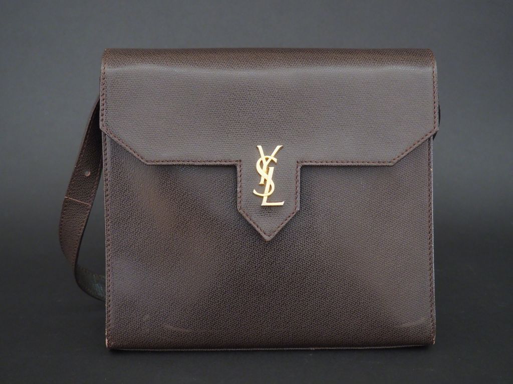 YVES SAINT LAURENT. Pochette marron H. 20,5 cm (rayures)