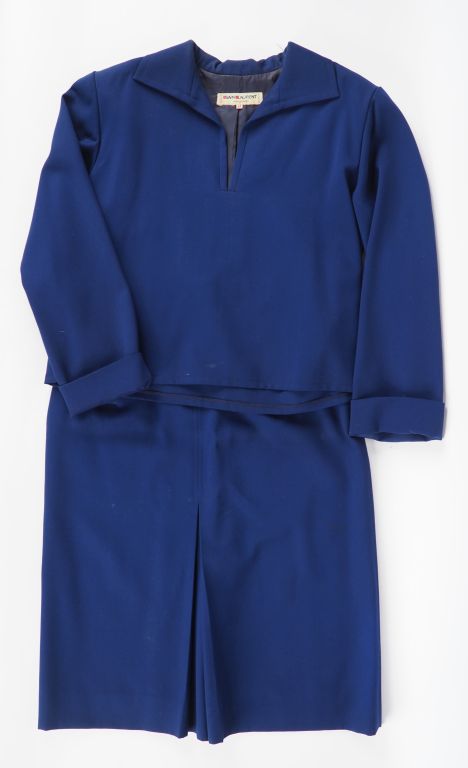 YVES SAINT LAURENT, Rive gauche Ensemble de tailleur, jupe et blouse, bleu. Blouse à col et encolure en V. Jupe longue, pli à l'avant. Fermeture latérale par zip. Modèle. 018 048624 Taille. 42 (petites tâches)