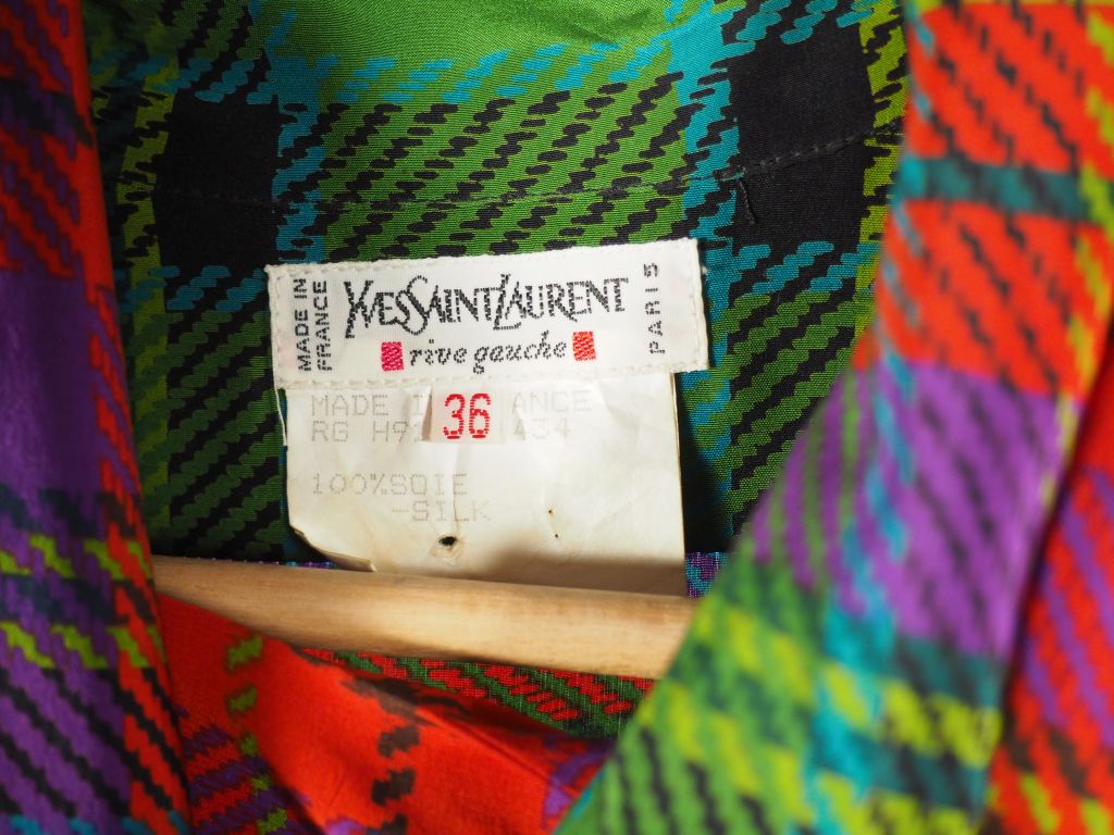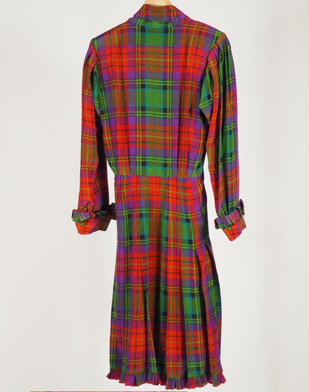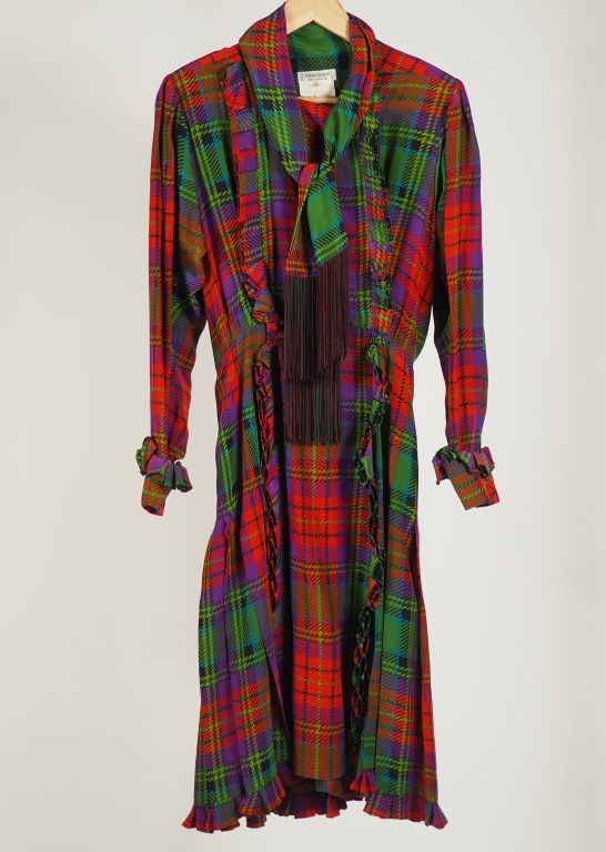 YVES SAINT LAURENT, Rive gauche Robe portefeuille en soie (100%) polychrome, à décor écossais. L'avant et le bout des manches agrémentés de volants. Le col agrémenté d'un foulard en trompe l'œil orné de franges. Taille. 36