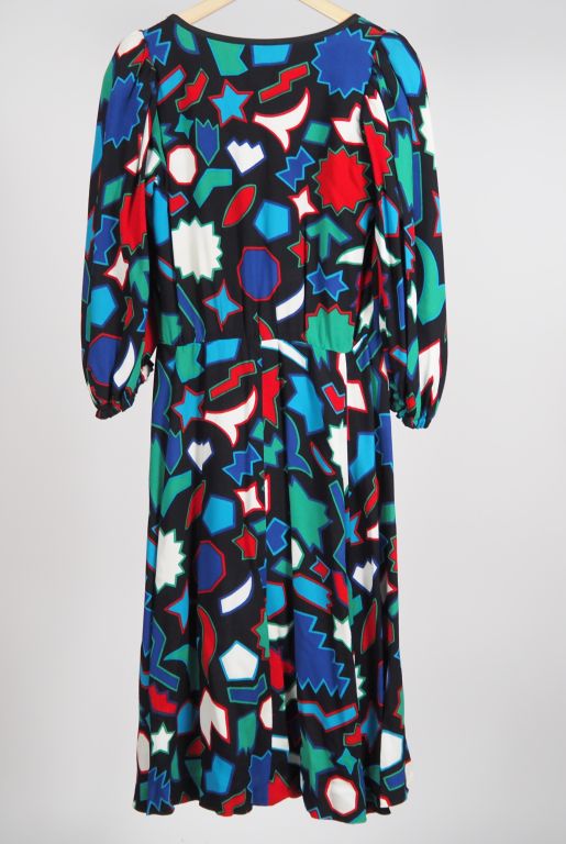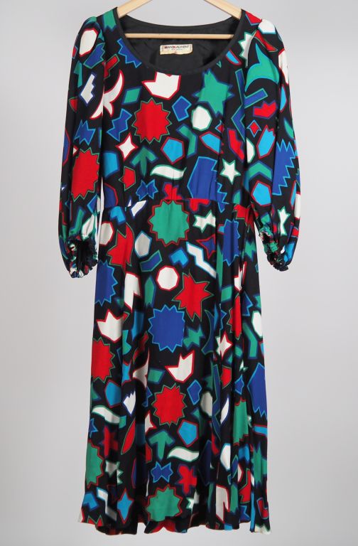 YVES SAINT LAURENT, Rive gauche Robe probablement en partie en soie, à décor bariolé de motifs géomtériques sur fond noir. Manches longues, ballons. Fermeture à zip sur le côté. Taille. 42 (absence d'étiquette indiquant la composition)