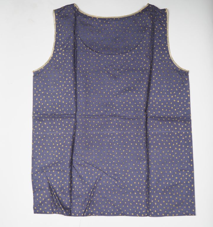 YVES SAINT LAURENT, Rive gauche Tunique sans manche, à décor tâcheté de doré sur fond violet. Galon doré à l'encolure et sur les manches. Taile. 42 (pas d'indication de composition)