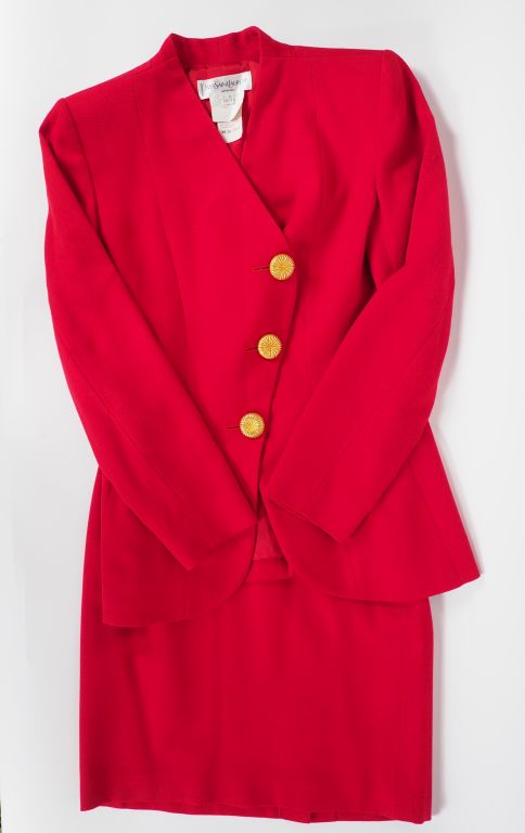 YVES SAINT LAURENT, Variation Ensemble de tailleur, veste et jupe, en laine (100%) rouge. La veste à épaulettes, fermeture asymétrique par trois boutons en métal doré. La jupe courte, petite fente à l'arrière. Fermeture latérale par zip et bouton. VA H96 1 068 Taille. 38 (petites tâches)