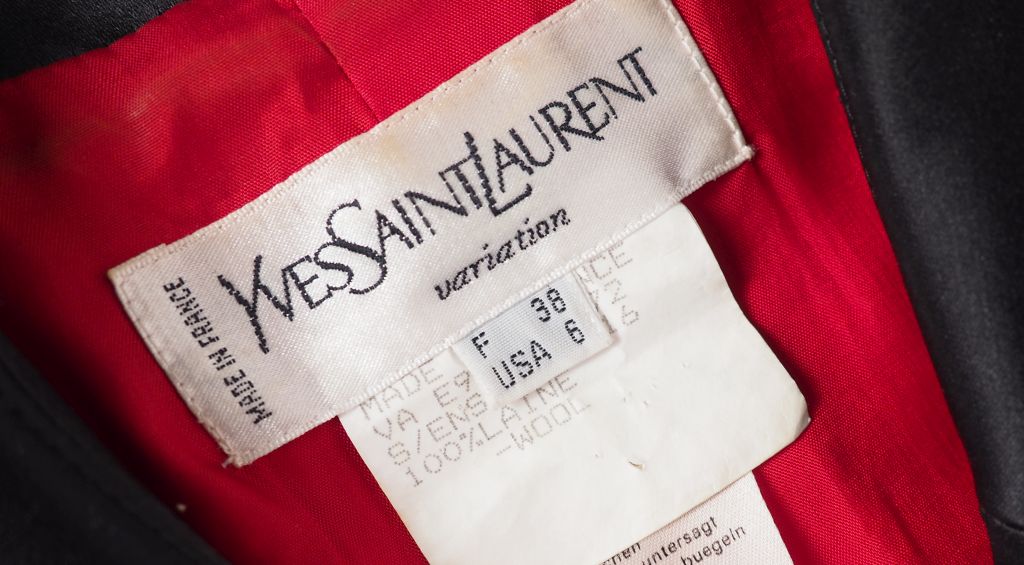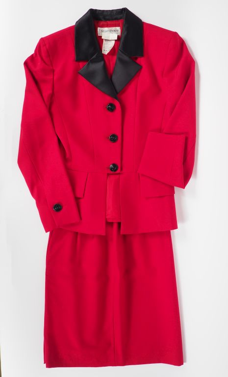 YVES SAINT LAURENT, Variation Ensemble de tailleur, veste et jupe, en laine (100%) rouge. La veste à col noir, ouverture par l'avant à trois boutons noirs. Les manches agrémentées d'un bouton. Deux fausse poches à rabat. La jupe courte à pinces, fermeture latérale par zip et bouton. VA E96 1 072 Taille. 38 (petite tâche et petit trou à la jupe)