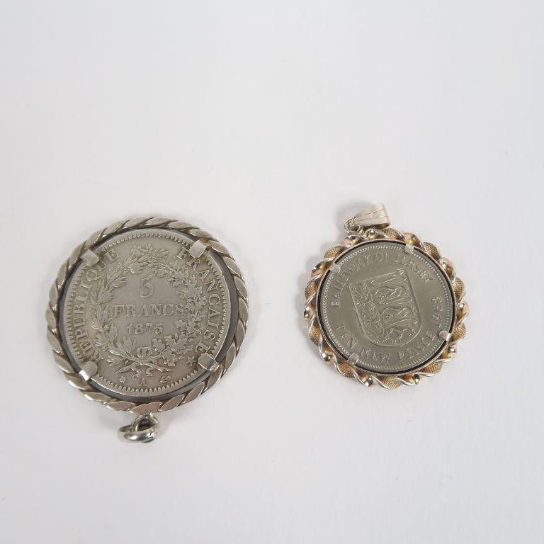 Une pièce de 5 Francs en argent 1875-A, montée en pendentif. Poids. 32,59 g On y joint une pièce de 10 Pence 1968, monture argent.