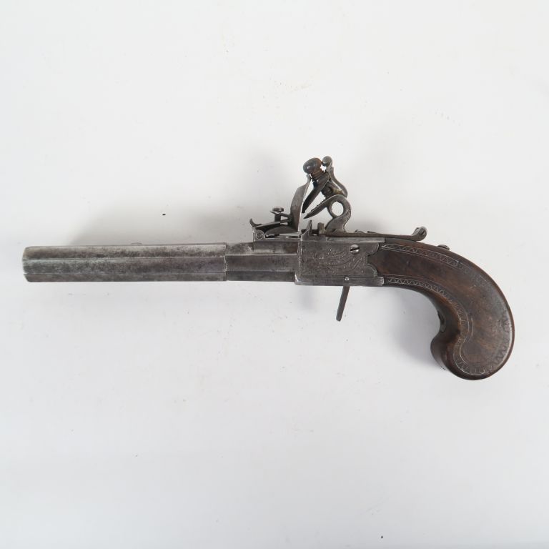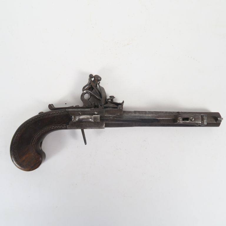 Beau et grand pistolet de défense à silex et à coffre de 230 mm de long. Arme à balle forcé, canon octogonal en calibre 44 balles à la livre, signature sur le flanc gauche « Williams », détente escamotable, chien à espalet, sureté à glissant, baïonnette a lame à trois pans creux dépliable par ressort sur le flanc droit du canon, crosse en noyer à flancs plats incrustés de fils d’argent, mécanisme fonctionnel.(Etat 1-)