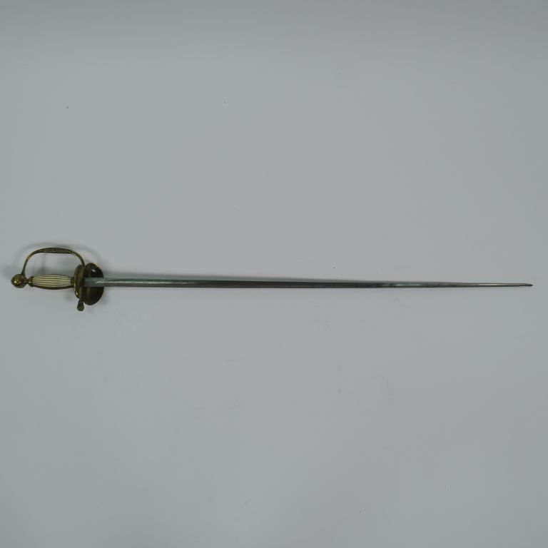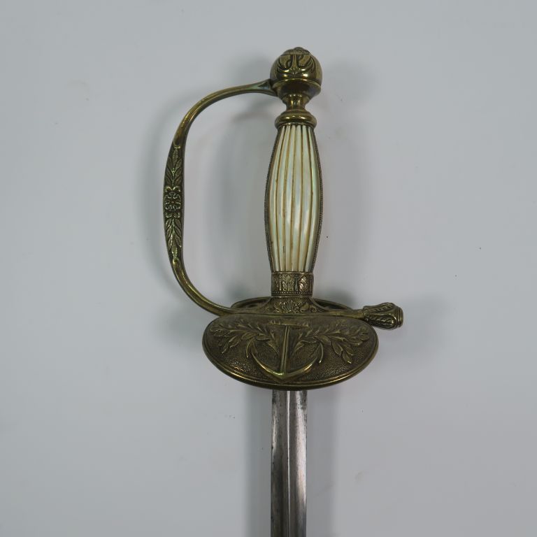 Belle épée à clavier époque Restauration/Empire monture en bronze doré et ciselé plateau principal à attribut d’une belle ancre de marine non étalinguée ni couronnée entourée de deux branches de laurier, pommeau rond gravé d’une ancre sur sa face avant, rivure en fleur éclose, la soie formant le pistil. Branche de garde principale et unique renflée et aplatie au centre avec gravure florale. Fusée bois habillée de plaquettes de nacre striées en long arrêtées en haut et en bas par deux viroles et bordées de bandes de laiton à motif de fleurettes. Lame triangulaire à trois pans creux, pas de fourreau, longueur totale 950 mm. (Etat 1)