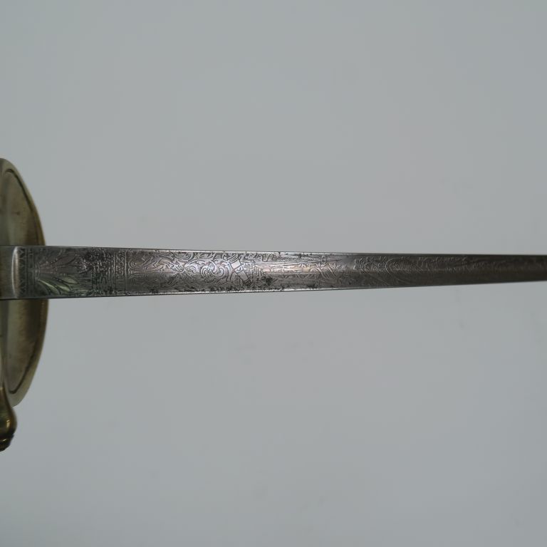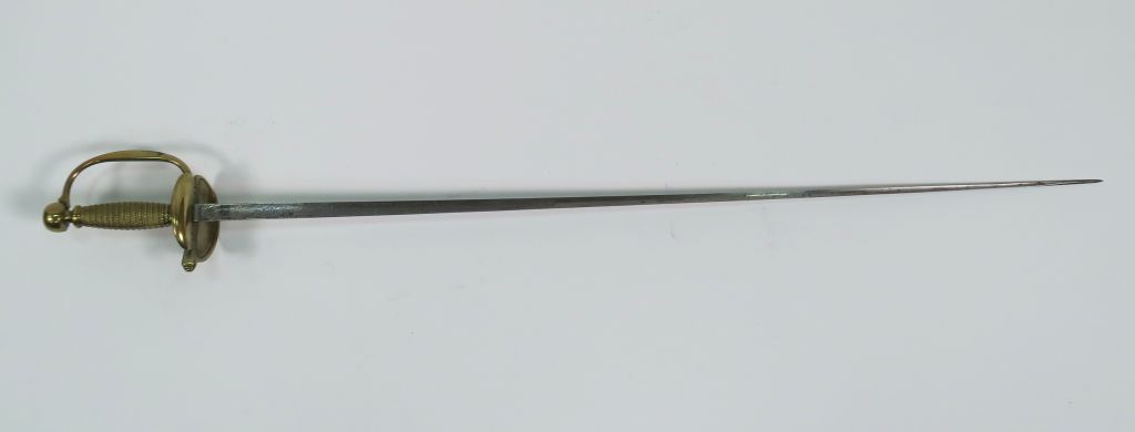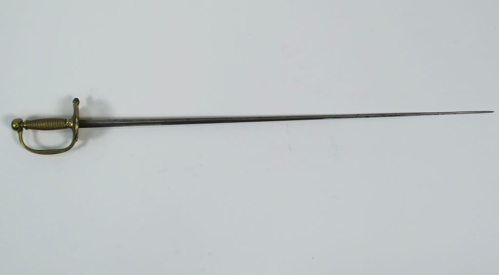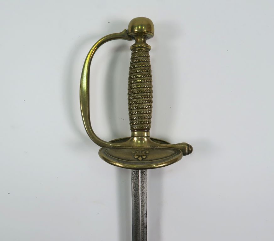 Belle épée d’officier époque Restauration. Monture en bronze fondu, pommeau boule lisse, branche de garde unique, quillon droit symétrique et aplati. Branche de garde symétrique principale arquée vers la lame et portant en relief une belle fleur de lys, petite branche de garde secondaire contrariée. Fusée bois filigranée d’un beau filigrane en double chevron sur lit de fin filigrane laiton. Lame triangulaire à trois pans creux a beaux décors gravés à l’acide. Pas de fourreau.(Etat 1)