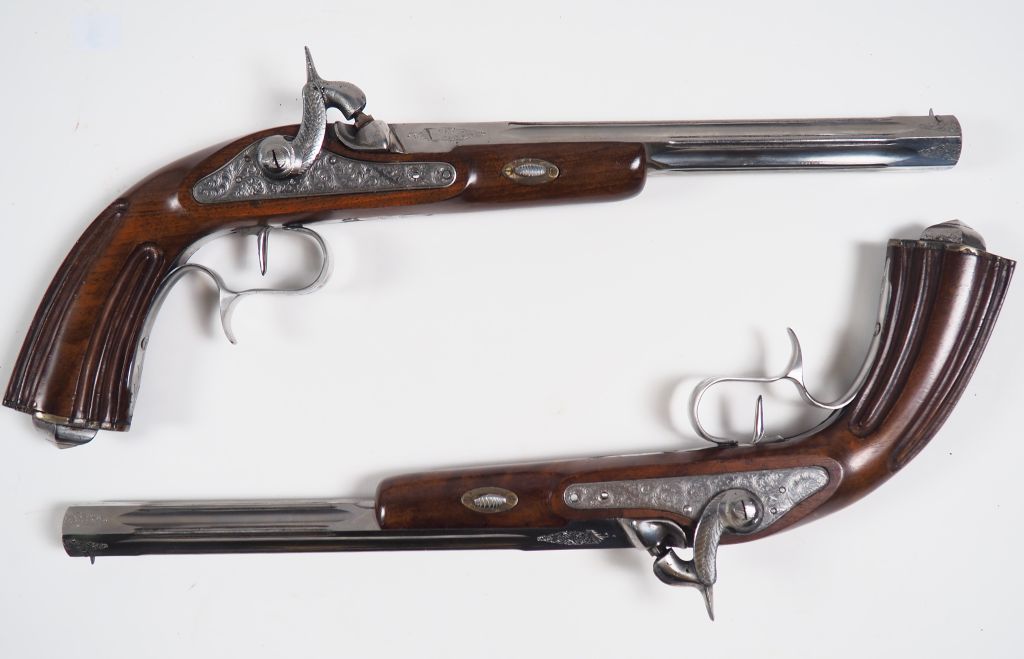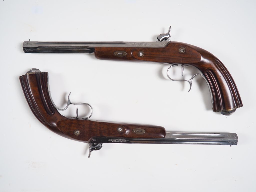 Coffret de duel ou de combat moderne contenant monté à la française sur velours lie de vin une paire de pistolets à percussion et platines à l’avant, canons octogonaux flutés et rayés en calibre 44 à balle ronde, le coffret contient tous les accessoires dont maillet, moule à balle poire à poudre, baguette, clef à cheminé, boite à amorce, brosses, etc. Les montures sont de type renaissance en noyer vernis. Toutes les parties métalliques des pistolets sont en acier poli blanc ou inox. Mécanismes fonctionnel. Fabrication Italienne ou Espagnole.