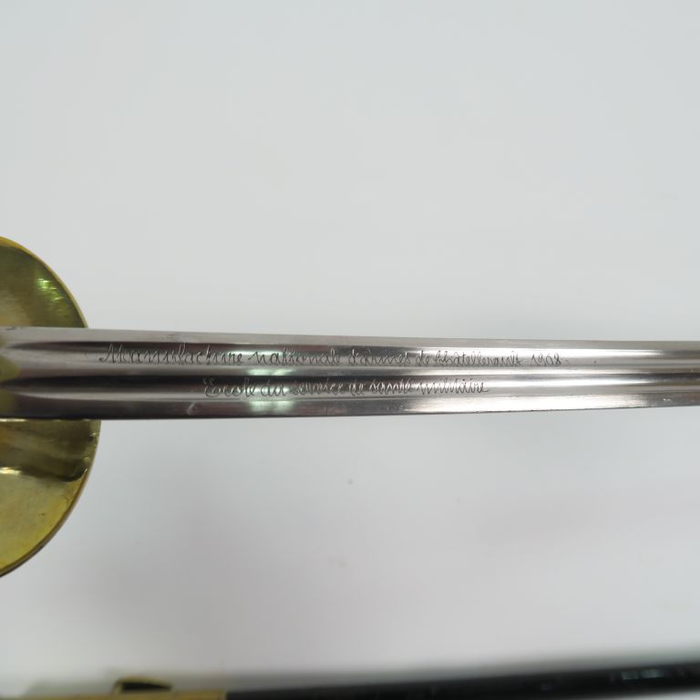Epée à clavier d’école du service de santé militaire. Monture en bronze fondu, pommeau rond, clavier principal fixe à décor d’un serpent d’un caducée le tout encadré d’une branche de laurier et d’une branche de chêne. fusée en bois filigrané, plateau secondaire rabattable à bille. Lame de section lenticulaire à deux fines gouttières portant gravé dans le creux « Manufacture nationale d’armes de Châtellerault 1908 Ecole du service de santé militaire ». Dans son fourreau en tôle d’acier peint en noir à deux garnitures et chape à bouton.(Etat 1).