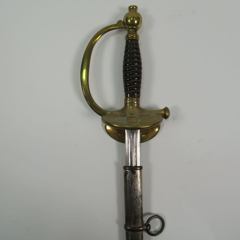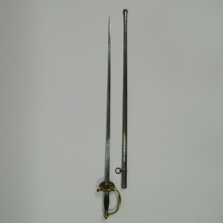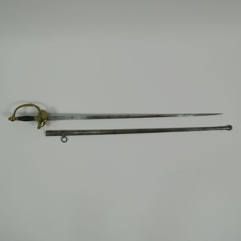 Epée à clavier d’officier subalterne du génie type 1852. Monture en bronze fondu, pommeau rond, clavier principal fixe à décor d’une cuirasse et d’un pot de tête, fusée en corne blonde filigranée, plateau secondaire rabattable à bille. Lame de section lenticulaire à deux fines gouttières. Dans son fourreau en tôle d’acier à un bracelet.(Etat 1).