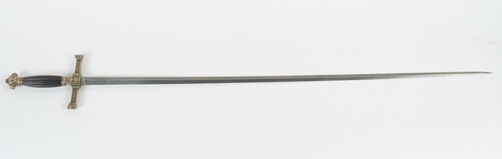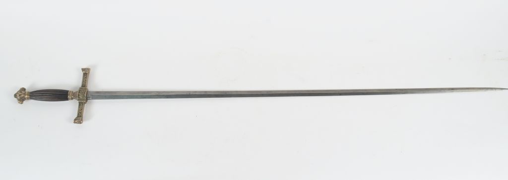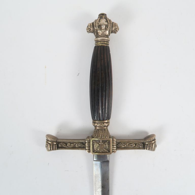 Epée de fantaisie époque second empire lame droite à 4 pans vierge de marquages, arme montée bronze, fusée en forme de fusaïole en bois sombre vernis et striée en long, pommeau symétrique au mufles léonins en relief sur les flancs et à la tête d’Athéna casquée sur les faces, Croisières de garde symétriques de section rectangulaires décaissées à quillon en tête à l’égyptienne. cartouche central au trophées d’armes. Sans fourreau. (Etat 1-)
