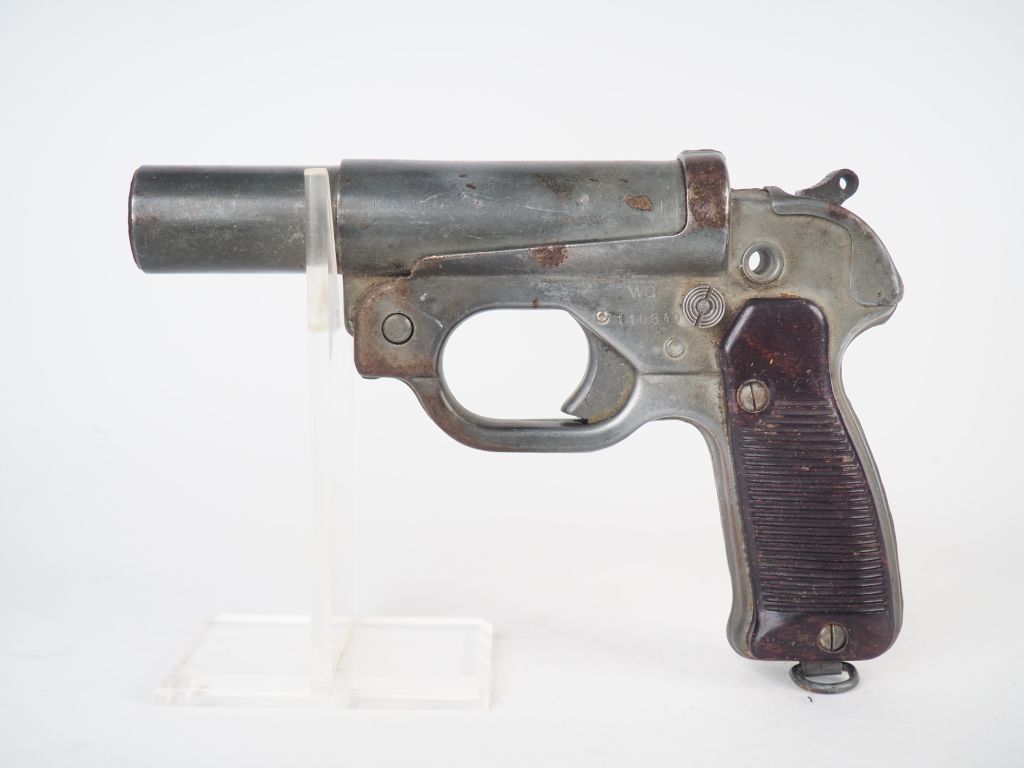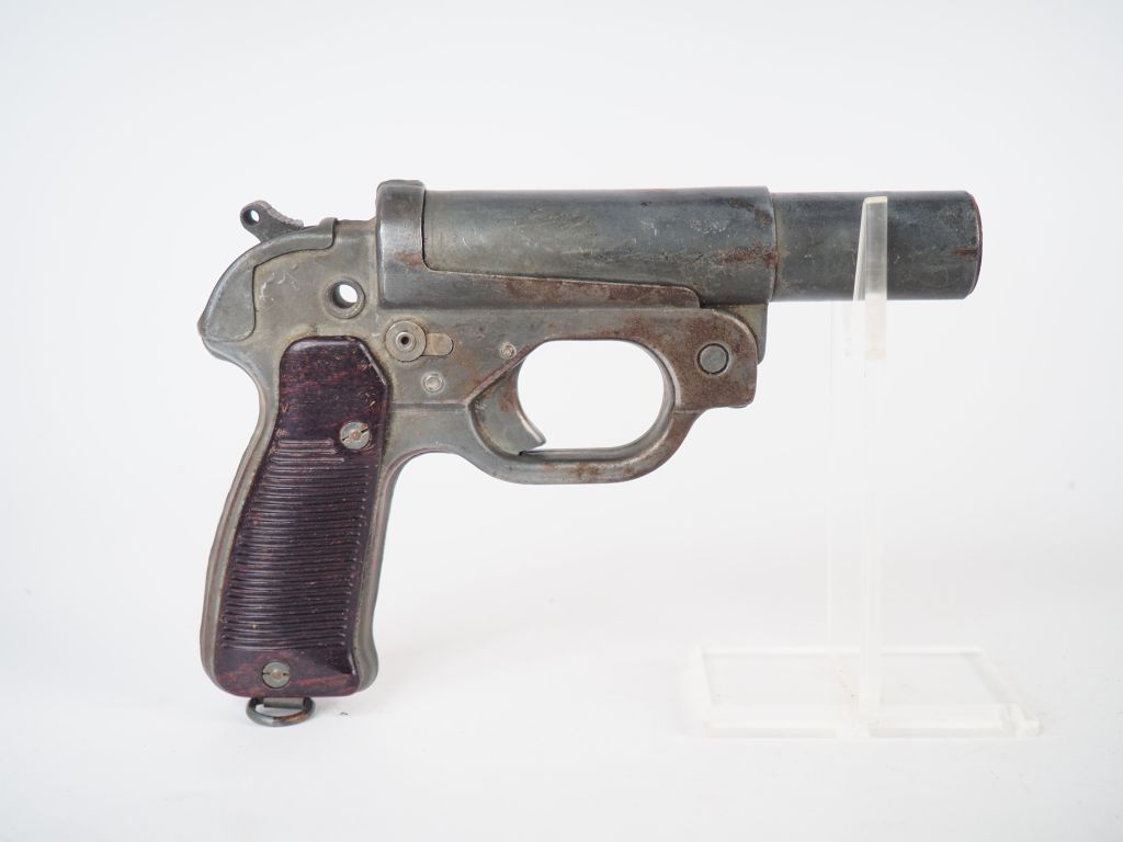 Lance fusée réglementaire allemand calibre « 4 » Type LP 42 en tôle emboutie phosphaté vert avec ses plaquettes en bakélite brune fabrication Walther (ac) numérotation dans le bloc « G ». Mécanisme fonctionnel. Arme de catégorie « D » (Etat 1)