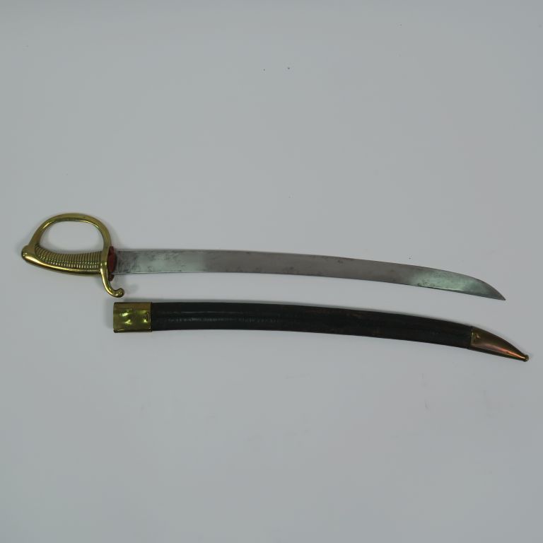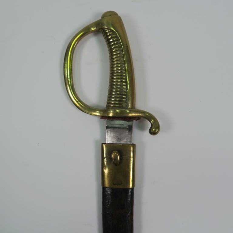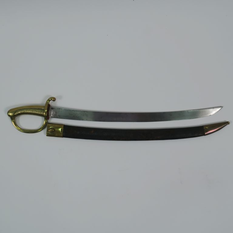 Sabre briquet modèle AN XI Lame marquée au ricasso « REMSCHEID » et « HENRAUX Jnr ».Monture bronze fondu. Dans son fourreau cuir à deux garnitures laiton(chape à bouton) . (Etat 1-)