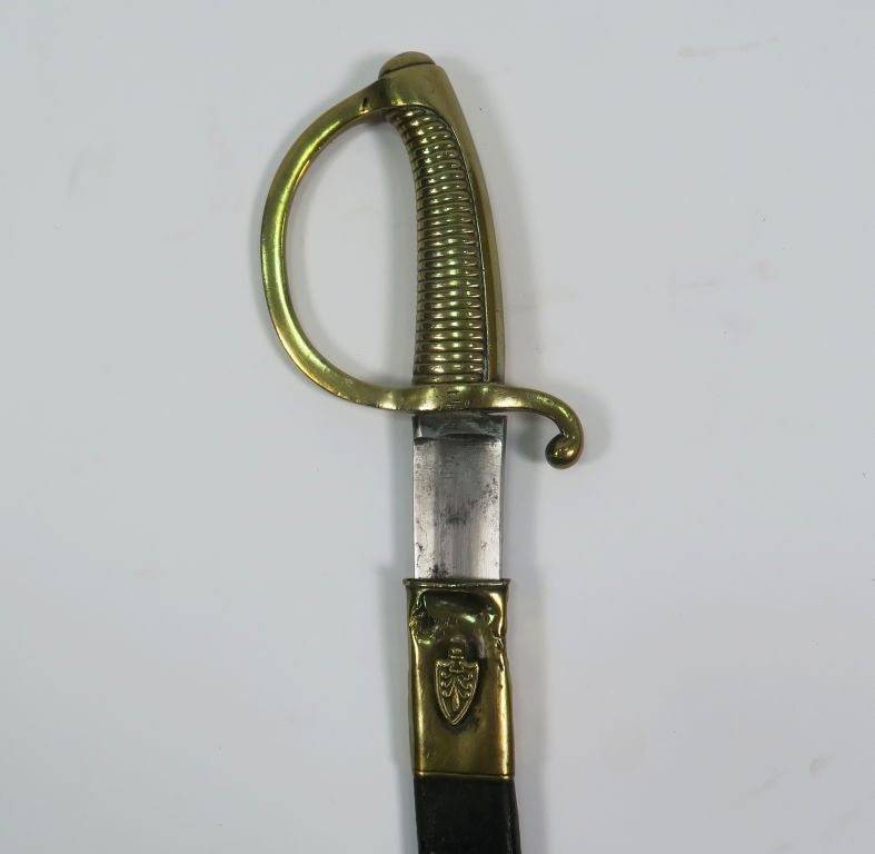 Sabre briquet type AN XI de petite proportion fabrication de l’industrie privée. Monture bronze fondu. Lame plus courbe qu’à l’accoutumée avec gorge d’allégement. Dans son fourreau cuir décousu à deux garnitures laiton avec chape à bouton en forme d’écu. (Etat 1-)