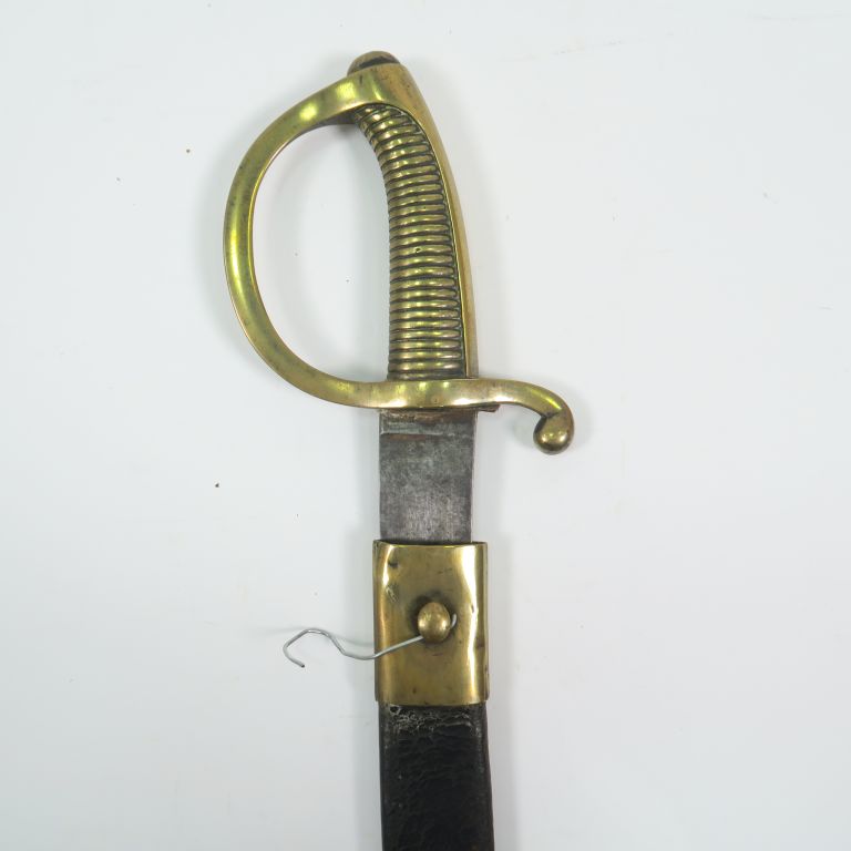 Sabre briquet type AN XI. Monture bronze fondu. Lame courbe sans marquages. Dans son fourreau cuir noir à deux garnitures laiton avec chape à bouton rond. (Etat 1-)