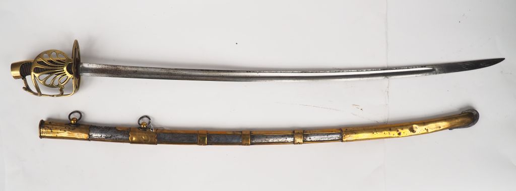 Sabre de la maréchaussée de France au règlement de 1783 (Référence Michel Petard tome 1er Des sabres et des épées page 110 référence 105 R). Monture en bronze fondu calotte ovale à courte queue et bouton de rivure rond et proéminent, courte coquille en coquille st Jacques encadrée d’une accolade et renforcée de deux branches secondaires partant de la branche de garde principale. Fusée entièrement filigranée. Lame plate à pointe dans l’axe vierge de marquage dans son fourreau en cuir à garnitures laiton, chape et bracelets à découpe en accolade portant pitons laiton soudé et anneaux (différent du fourreau décrit par M Pétard). (Etat 1)
