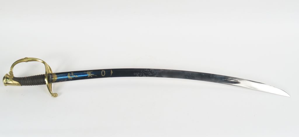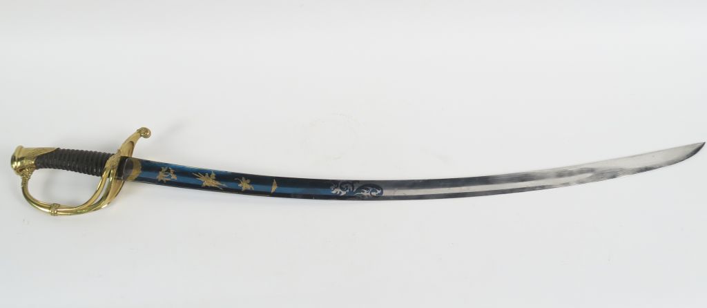 Sabre d’officier d’infanterie modèle 1821. Lame courbe à gorge et dos plat forgé à Solingen par P knetch et somptueusement enrichi de gravures à fond doré à l’or moulu sur un lit bleu queue de paon intact. Monture en bronze fondu ciselé, branche de garde unique se dédoublant au demis depuis une bague gravée et joignant le plateau. Fusée bois habillée de chagrin et filigranée. Pas de fourreau. (Etat 1).