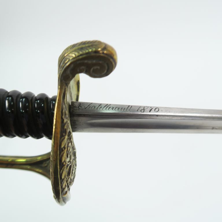 Sabre modèle 1845 d’adjudant, monture en bronze fondu ciselé, calotte à courte queue, plateau découpé à jour avec volutes de feuillage. Quillon arque vers l’avant, fusée bois noir filigrane absent. Lame droite à gorge et fine gouttière, dos plat, long contre tranchant. Signature au dos de la lame «Châtellerault 1870». Fourreau noirci en tôle d’acier à deux bracelet.(Etat 2+)