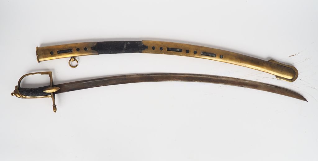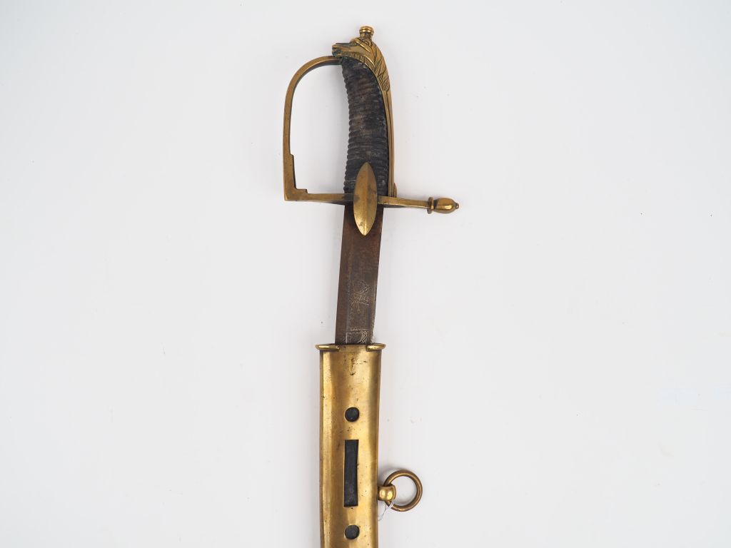 Sabre troupe de hussard primitif, monture à la hongroise en bronze, calotte à longue queue, pommeau en pelisse de lion avec bouton de rivure proéminent, fusée en bois cordé habillée de chagrin lame courbe à gorge gravée de motifs divers dont le motif traditionnel d’un hussard sabre au clair surmonté de la devise « VIVAT HOUSSARDS » (gravure mal habile douteuse) .Fourreau bois habillé de cuir, longue bouterolle ajourée, dard fer, chape également ajourée. (Etat 1-)