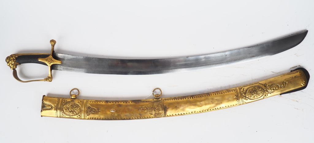 Sabre type officier de cavalerie dans le gout des sabres de récompense du Directoire, large lame sans gorge courbe vierge de marquage ou de décor. Réplique moderne de fourreau en laiton à dard dissymétrique en acier deux pitons soudés sur le fourreau ce dernier est décoré au repoussé de trophées d’armes sur sa face avant la face arrière est plus sobre, une frise de branche perpendiculaire à un trait surlignant le contour du fourreau court sur toute la périphérie du dos du fourreau simplement interrompue par des cartouches au niveau des emplacements de bracelets. Monture en bronze doré, pommeau en mufle léonin à la crinière en relief, calotte à longue queue, branche de garde unique joignant la croisière de garde à angle droit, longs oreillons symétriques concave à décor d’une fleur éclose . Belle évocation montage du 20 éme siècle. Etat 1.
