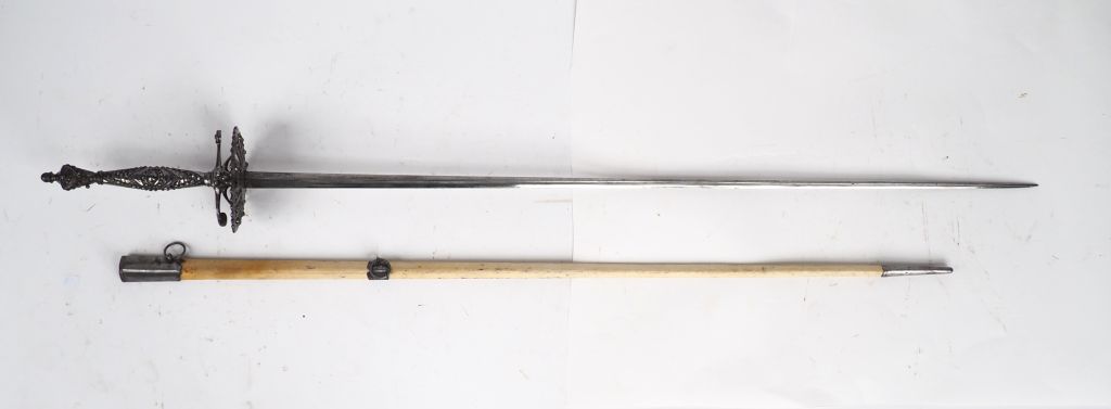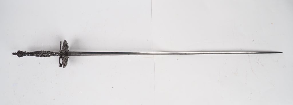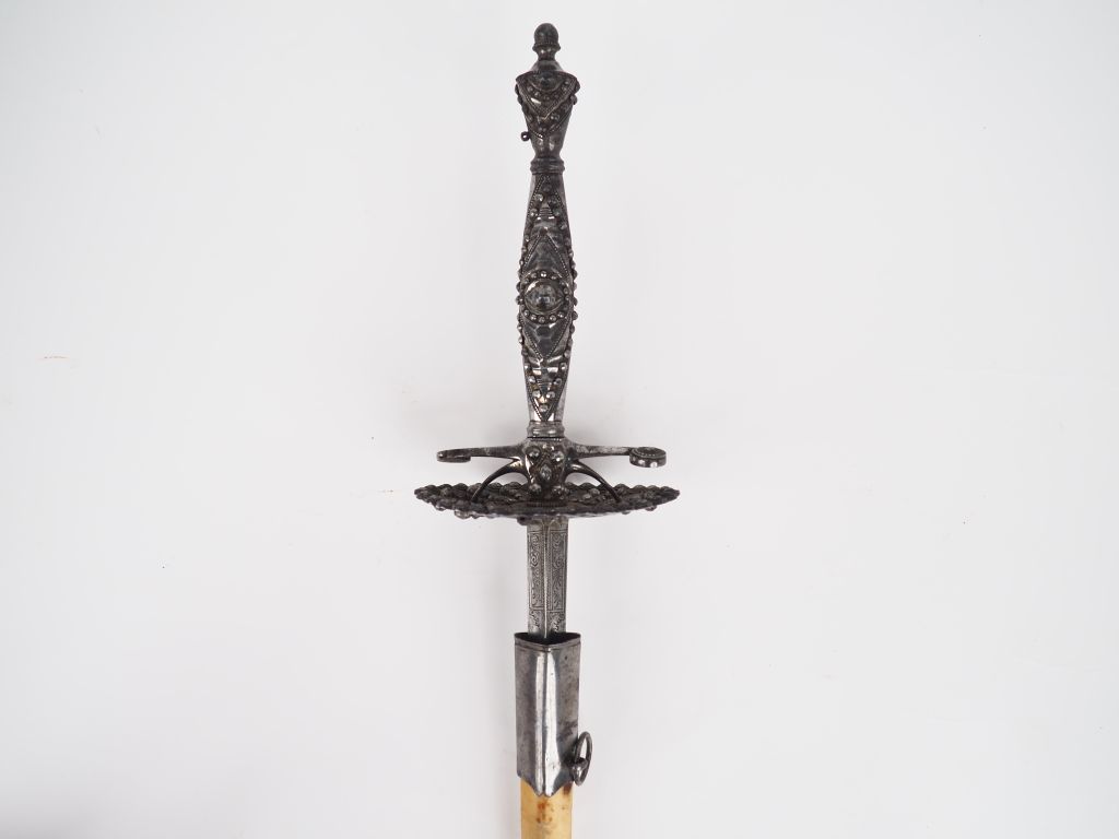 Superbe épée de cour, lame triangulaire à trois pas creux à décor de 7...