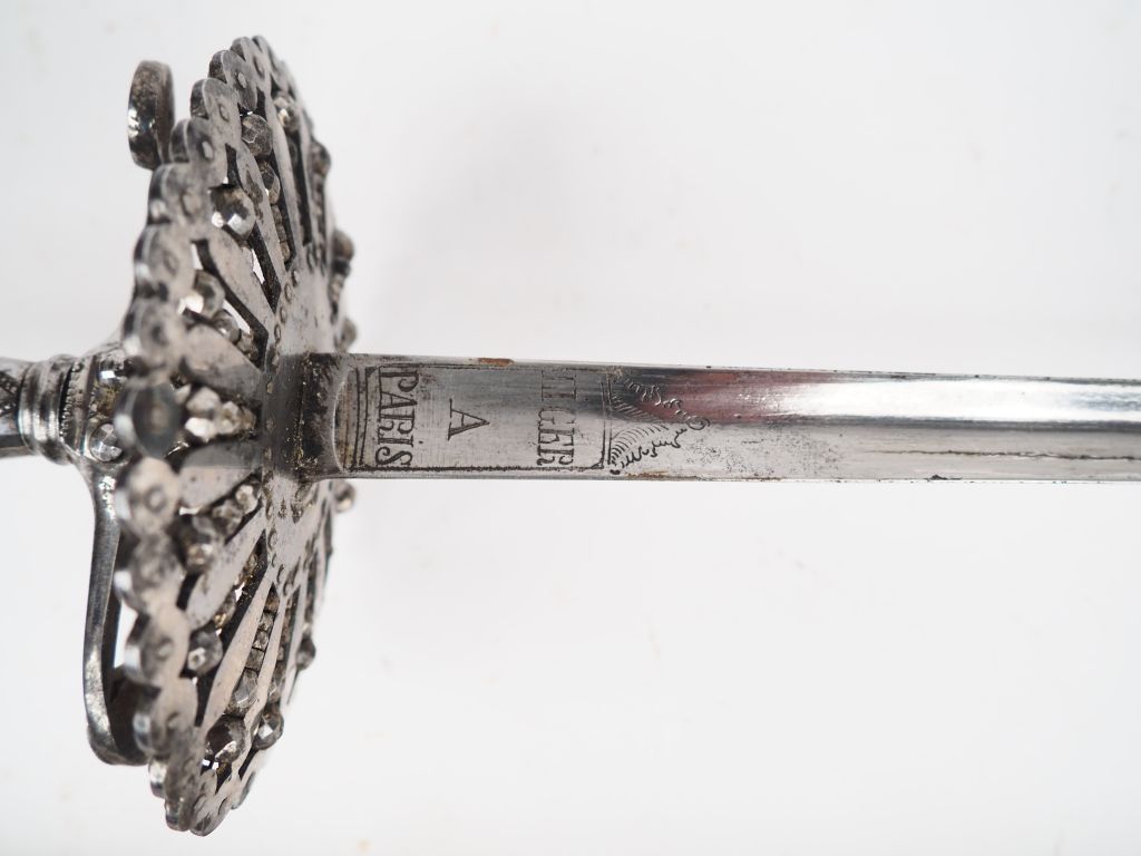 Superbe épée de cour, lame triangulaire à trois pas creux à décor de 740 mm de long signée dans le pan creux principal contre le plateau « LIGER A PARIS ». Superbe monture en marcassite d'acier polie à l’Agathe et entièrement décorée de perles en relief facettées et taillées à la manière pointe de diamants. Pas de branches de garde qui était à l’origine figurée par une fine chainette aujourd’hui disparue. Noeud de croisière a pas d'âne figuratif permettant de dater cette belle épée du règne de l’infortuné Louis XVI. Pommeau en urne, rivure proéminente en forme de gland. Plateau de garde ovale perlé sur sa face interne et lisse sur la face externe et ajouré de fenêtres habillées de perles à facettes captives (manque un des décors),croisière de garde contrariée à plat à quillon en boules aplaties. Fourreau à âme bois gainé de parchemin blanc à trois garnitures d'acier (chape à anneau, bracelet également à anneau et bouterolle le tout en fer.(Etat 1+)