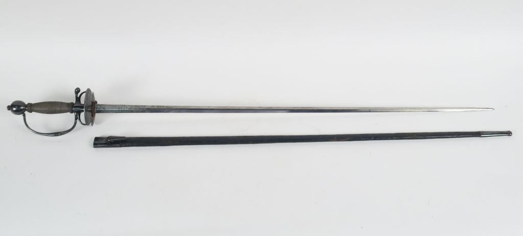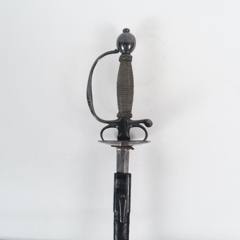 Très belle épée de sergent au règlement de 1767. Lame droite à 6 pans de 735 mm de long, gravée au tiers de volutes florales et portant une devise sur chaque face dans un cartouche ovale « RECTE FACIENDO NEMINEM LIMEAS » (Faire ce qu’il faut personne ne l’imite). Belle monture du modèle en fer bronzé, fusée filigranée finement d’un filigrane fer à chevrons inversés, deux viroles en tresse de filigrane délimitent la jonction aux deux extrémités entre la monture et la fusée., branche de garde unique, quillon en crosse droit, deux pas d’âne et plateau bivalve symétrique. Dans son fourreau cuir noir à deux garnitures fer dont chape à long crochet. Très beau témoignage de l’armement Français à l’époque des guerres en dentelles ! (Etat 1+)