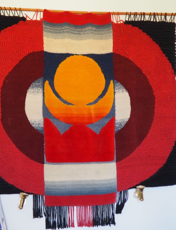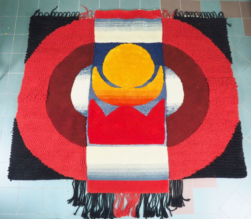 WEI ZHIXIONG. Grand panneau en laine polychrome avec un soleil au centre "Les nuages disparaissent au lever du soleil" Œuvre acquise lors d'une exposition à Pékin en 1988 Dim : 255 x 285 cm