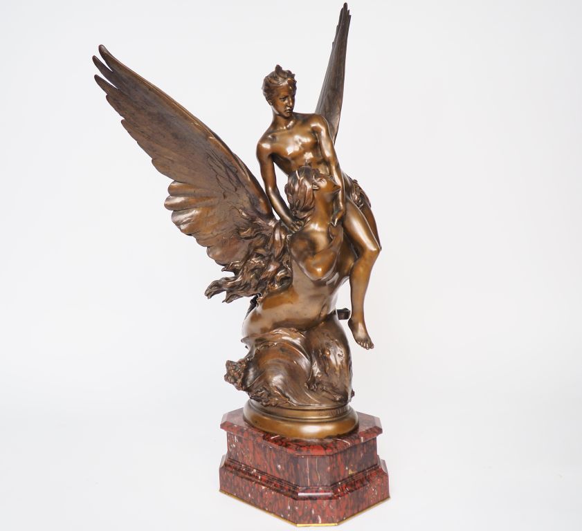 Denis PUECH. "la sirène". Sculpture en bronze à patine brune sur un socle en marbre rouge. Signée H. 80 cm H. avec le socle : 93,5 cm