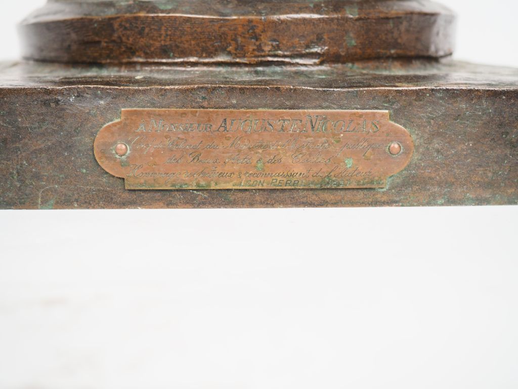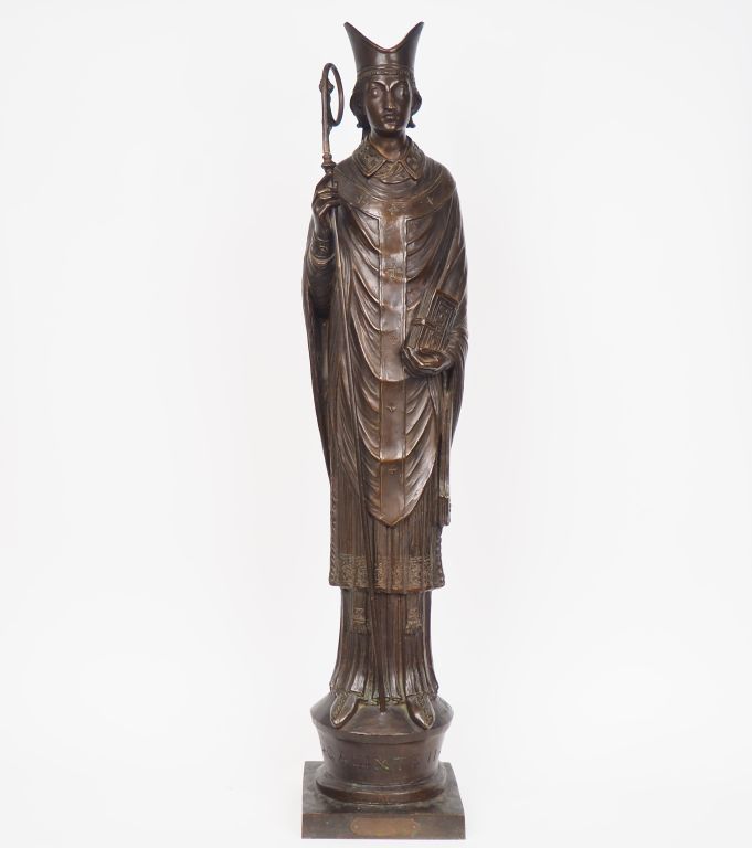 Léon PERREY. "St Calixte" Grande sculpture en bronze à patine brune. H. 119 cm (crosse à revisser)