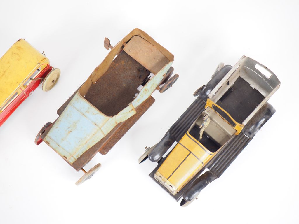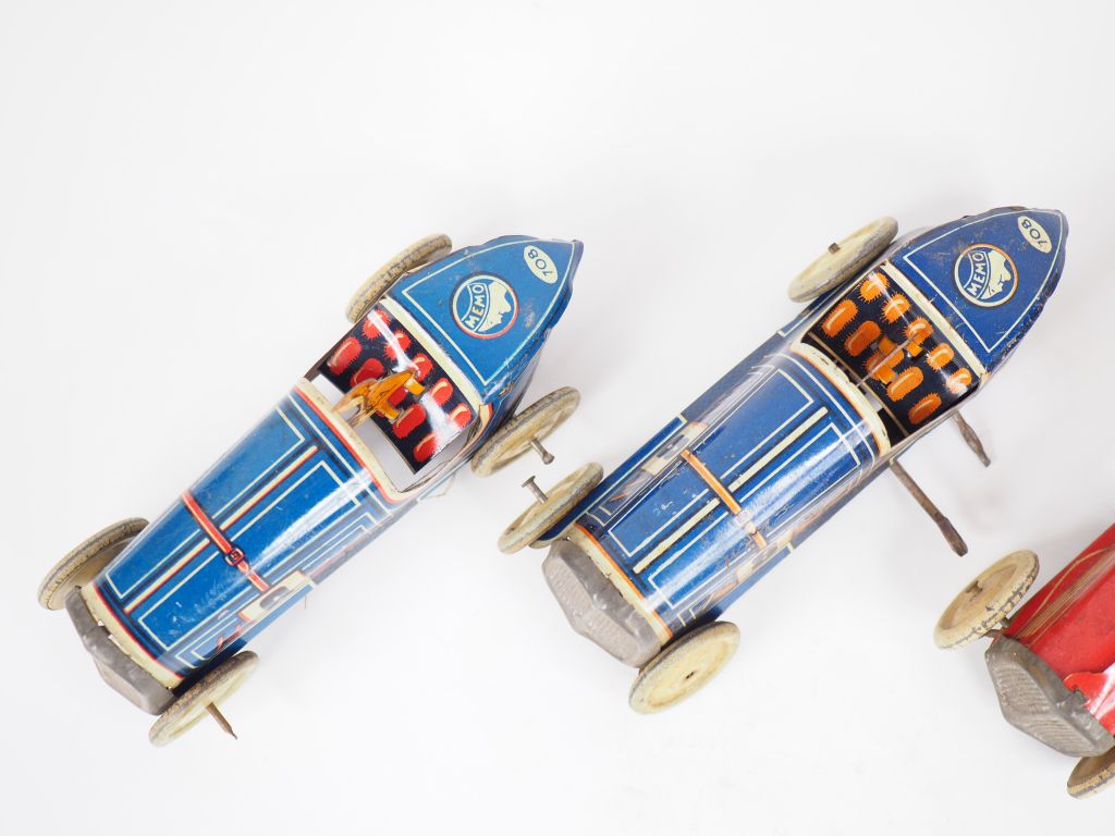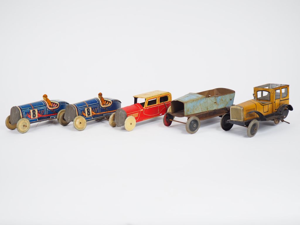 Cinq véhicules en tôle lithographiée, début XXème (premier quart), état d’usage et manques, dont deux voitures Memo de courses ( mécaniques ) avec pilotes.