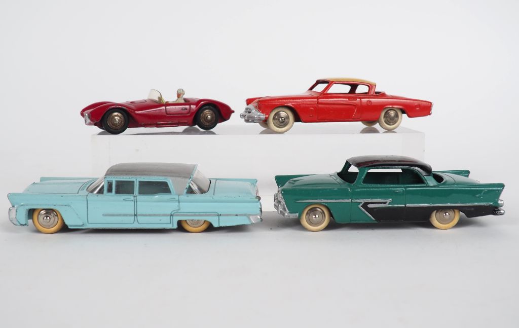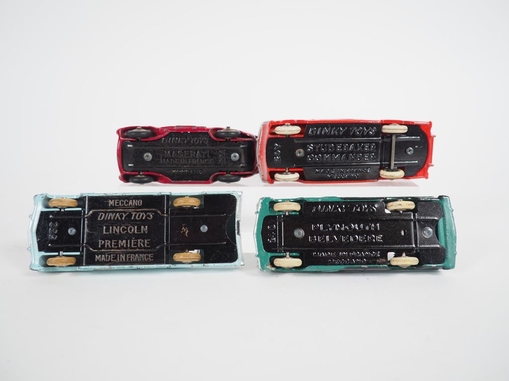 Dinky toys France lot de 4 miniatures au 1/43e dont : Maserati 22A (petites écaillures) , Lincoln Première (en l’état) , Plymouth Belvédère (écaillure sur capot) , Studebaker Commander BE d’usage