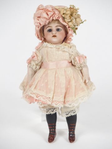 Mignonette allemande Simon et Halbig entièrement en porcelaine, vêtements cousus dessus, rendant impossible l'examen du corps, 18 cm, yeux refixés