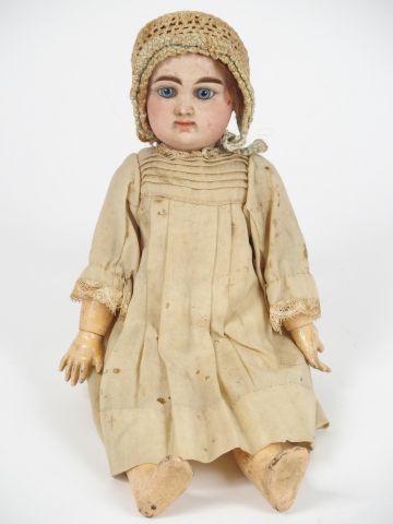 Petite poupée gravement accidentée à la tête, avec manque, marque Rabery Delphieu, yeux fixes bleu, bouche fermée, corps articulé d'origine, vêtements anciens. 32 cm