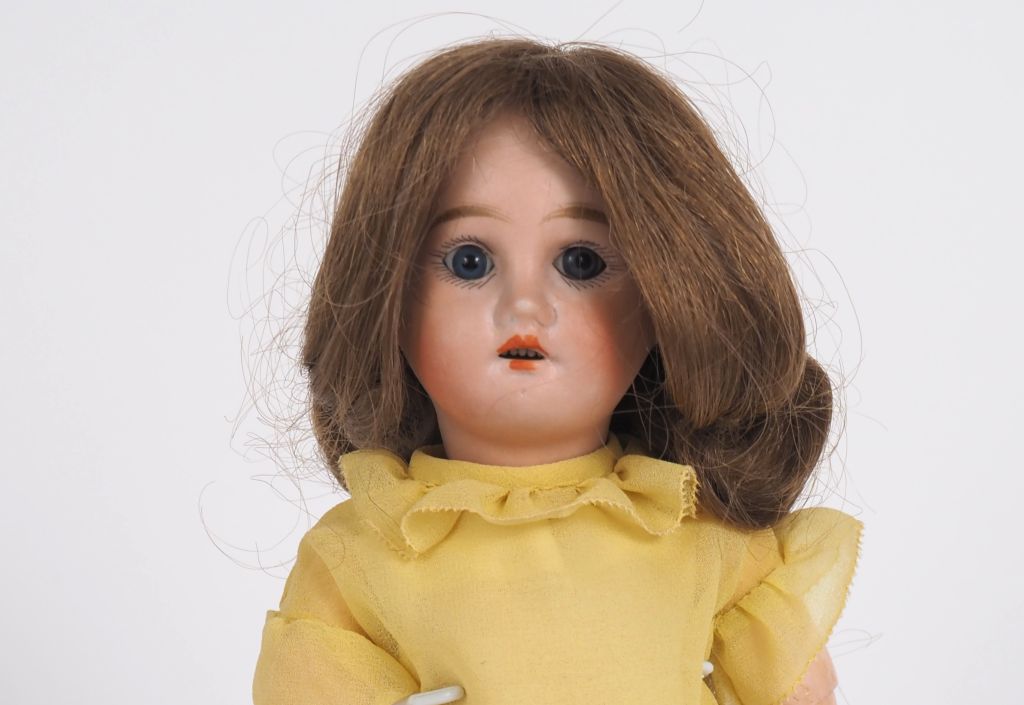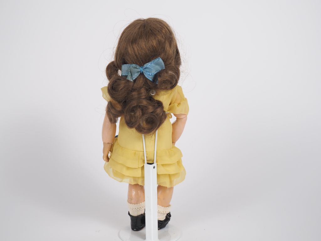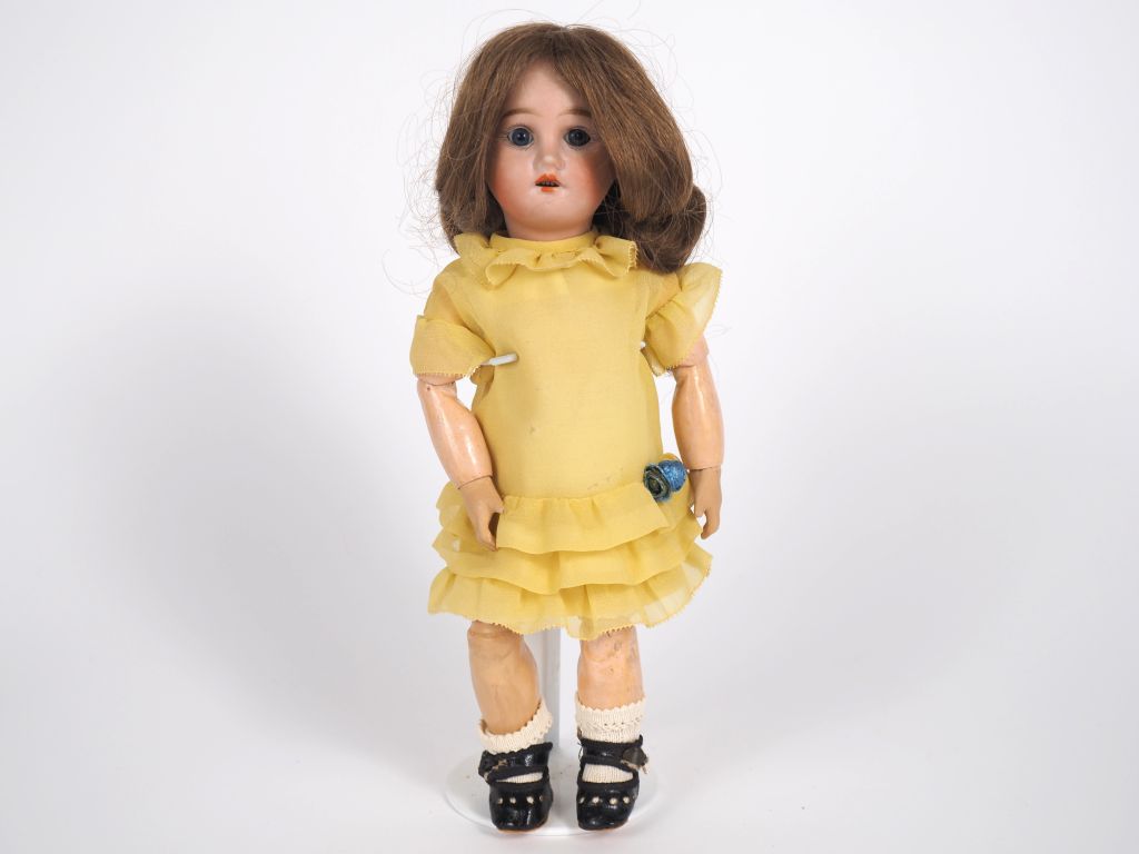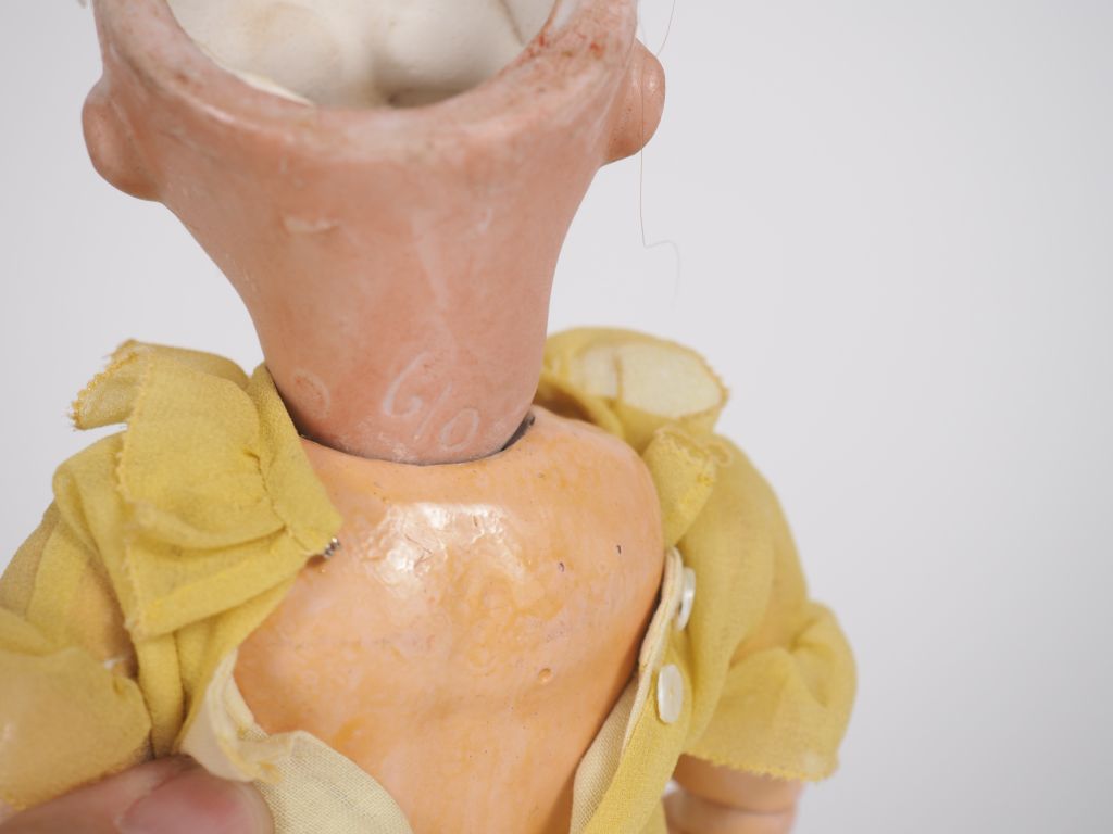Poupée Bleuette Fleischmann tête porcelaine bouche ouverte yeux fixes bleus perruques cheveux naturels récente, marqué sur la tête 6/0 corps composition articulé marqué 2 entre les épaules, Circa 1910-915. Taille 28 cm. Vêtements de style Gautier-Languereau, chaussures et chaussettes anciennes.