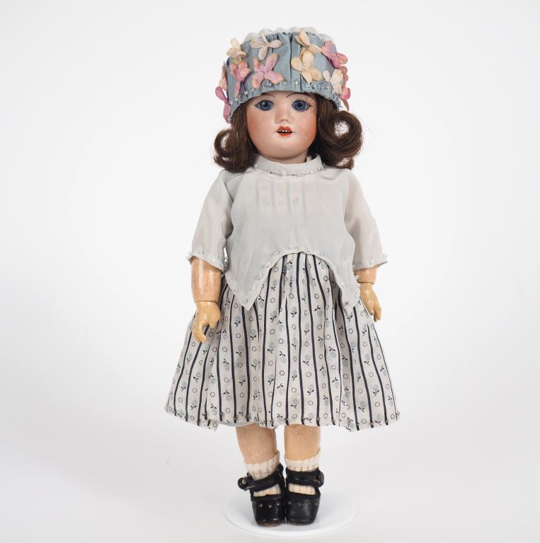 Poupée Bleuette SFBJ, tête porcelaine bouche ouverte yeux fixes bleus perruque cheveux naturels, tête marquée SFBJ 60 8/0 corps composition articulé marqué 2 entre les épaules et 1 sous les pieds, circa 1916 1920. Taille 28 cm. Bon état général légère déformation du buste à la jonction de la tête ne permettant pas à la tête de bien rentrer. Vêtements d’après le modèle « Stella » réédition, chaussures chaussettes anciennes Gautier-Languereau