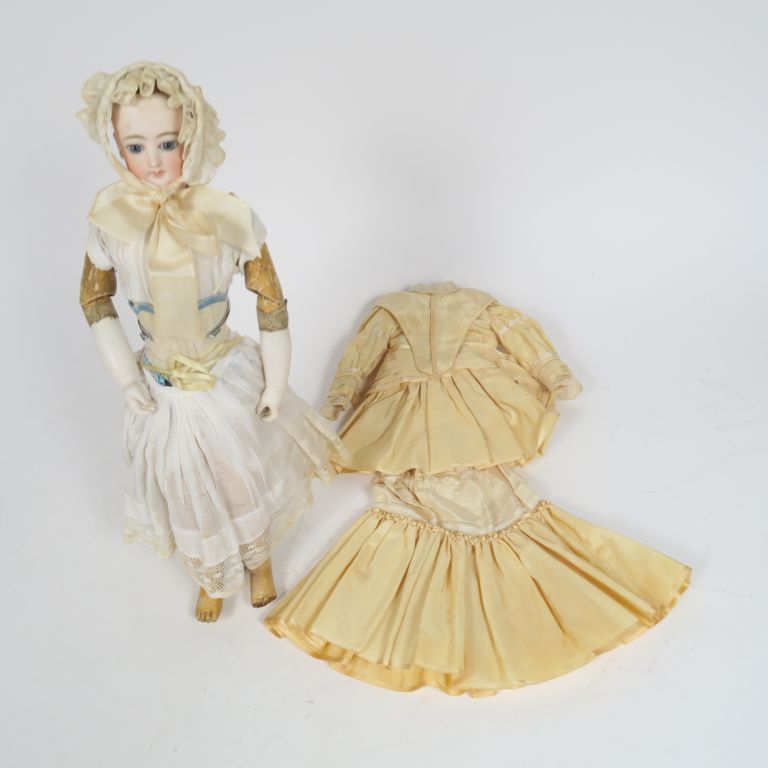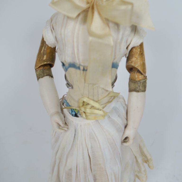 Poupée dite parisienne tête porcelaine de marque Gautier marquée 2, la bouche est fermée, les yeux fixes sont en émail bleu, la tête présente une décoloration au front, la collerette en porcelaine paraît en bon état, le corps composition articulé en bois avec les mains et avant-bras en porcelaine présentent un accident avec recollage à une main, le vernis et la peinture du corps en bois sont en mauvais état, la poupée fait 40 cm, sous-vêtement et corset ancien taille 40 cm