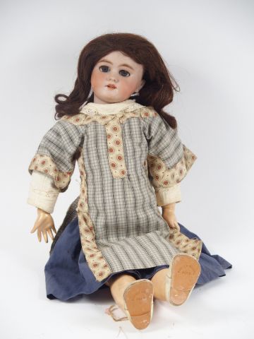 Poupée tête porcelaine DEP taille 8, yeux basculants bleu, bouche ouverte, corps composition articulé d'origine, partie de vêtements anciens, blanc sur le visage