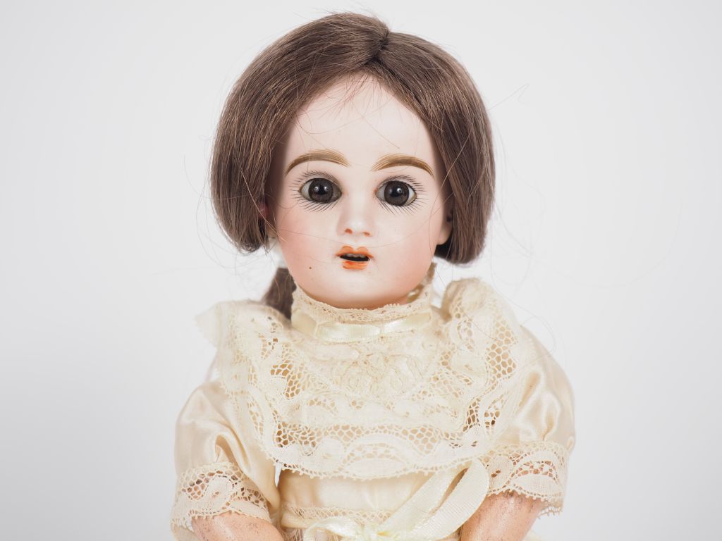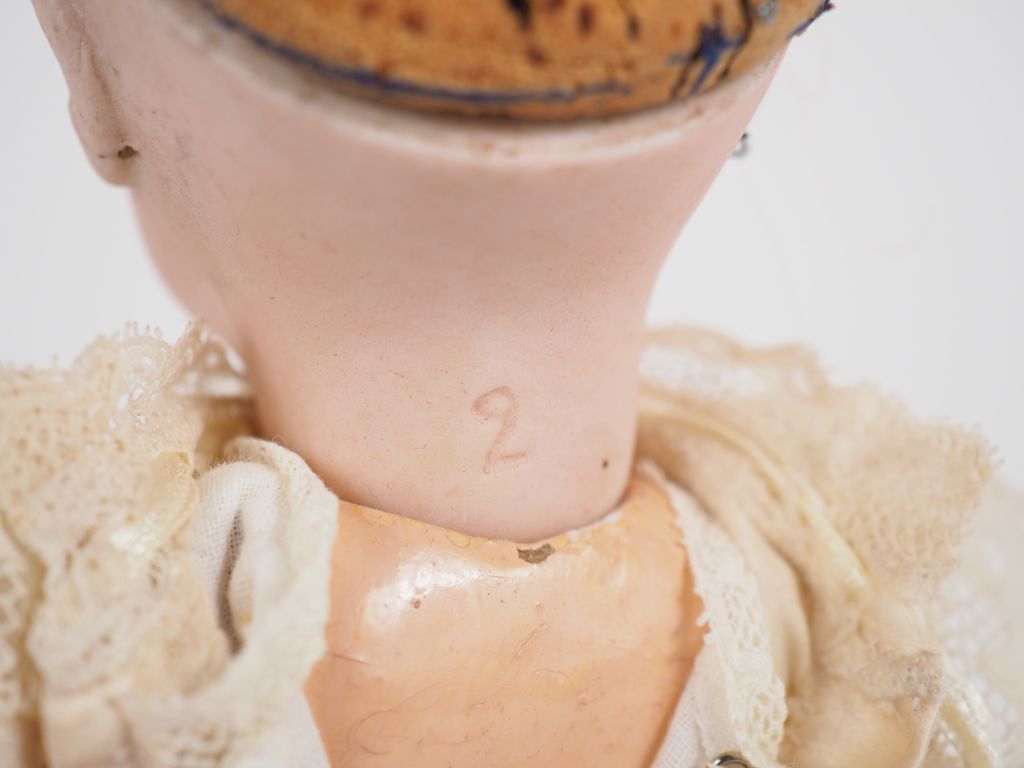 Poupée type Bleuette Jumeau marqué 2 en creux sur la tête la tête porcelaine bouche ouverte aux yeux fixes bruns perruques châtains de style, corps composition type Jumeau. Circa 1900-1910. Taille 28 cm. A signaler points de cuisson sur le visage, bulle de cuisson également sur le rebord en haut de la tête. Vêtements de style et chaussures de style