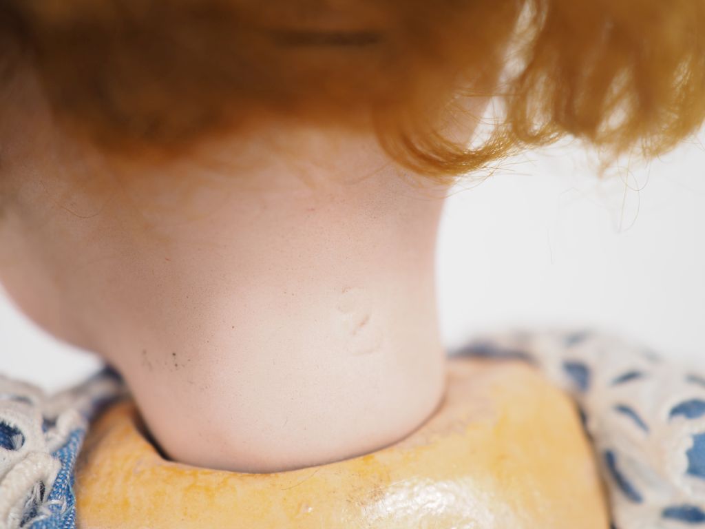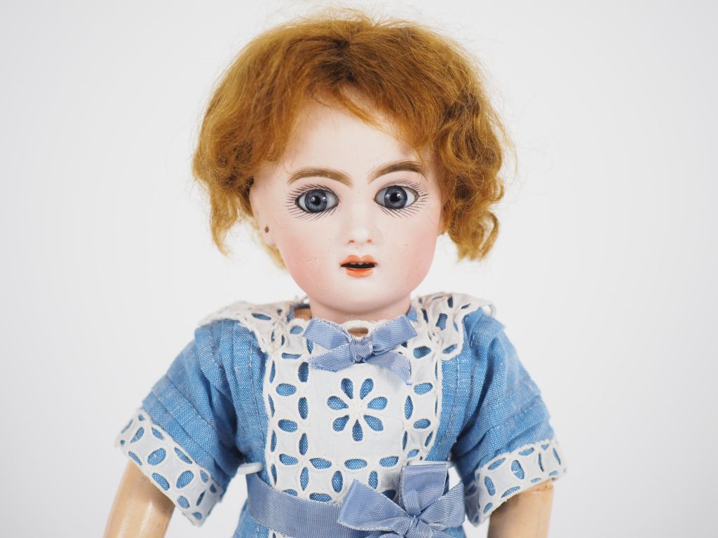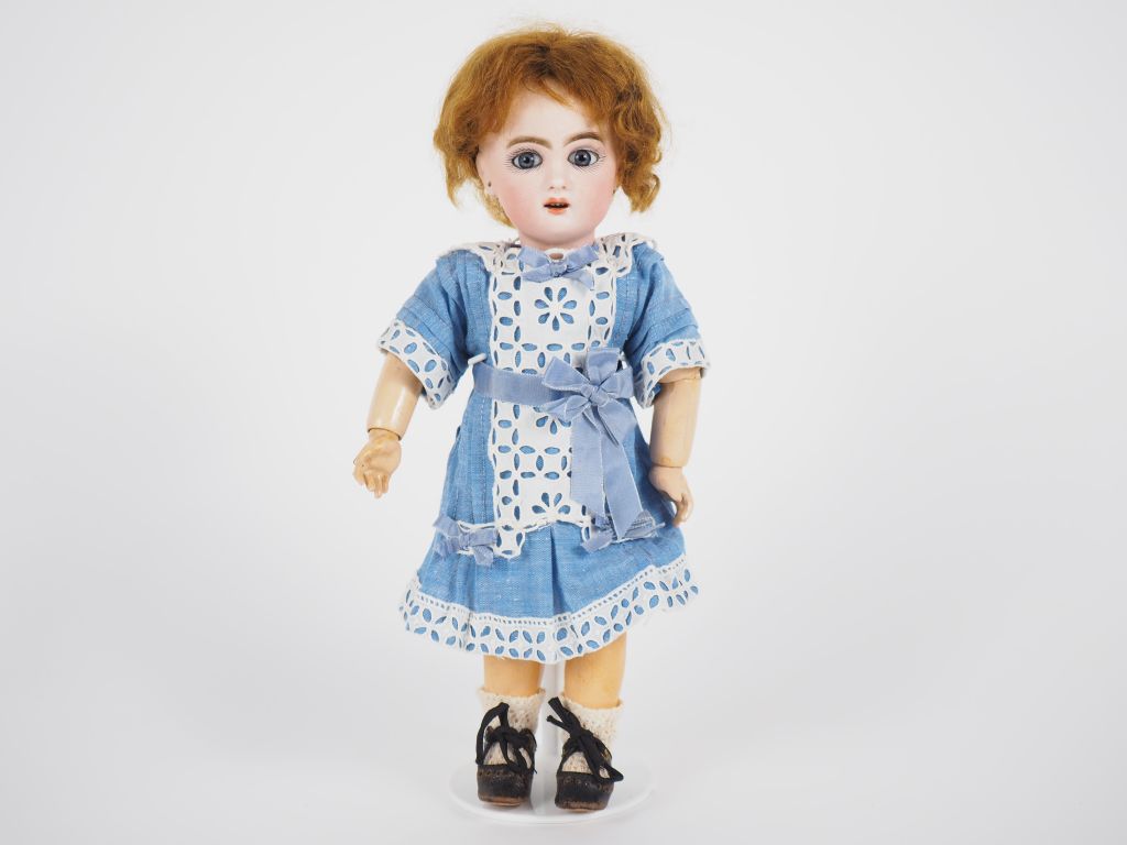 Poupée type Bleuette Jumeau marqué 2 tête porcelaine bouche ouverte avec 4 dents les yeux sont fixes bleus la perruque est châtain roux en mohair récente, le corps en composition articulé est marqué 2 entre les épaules et rien sous les pieds Circa 1905. Taille 27,5 cm. A signaler une trace sur la porcelaine SUR la joue droite. Vêtements, chaussures et chaussettes de style.